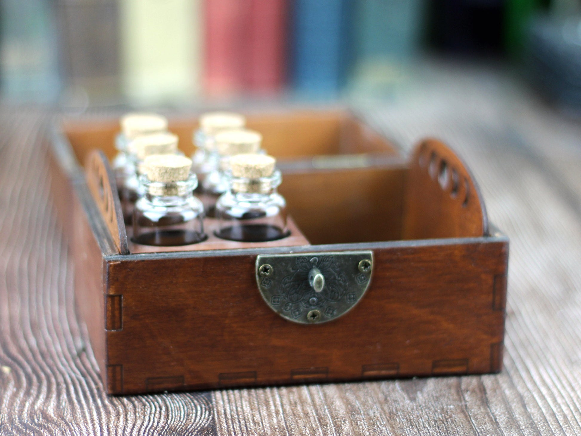 This handcrafted wooden apothecary box is designed to hold six 20ml glass bottles with cork stoppers, while leaving the other half of the box open for storing extra supplies, tools, or keepsakes.