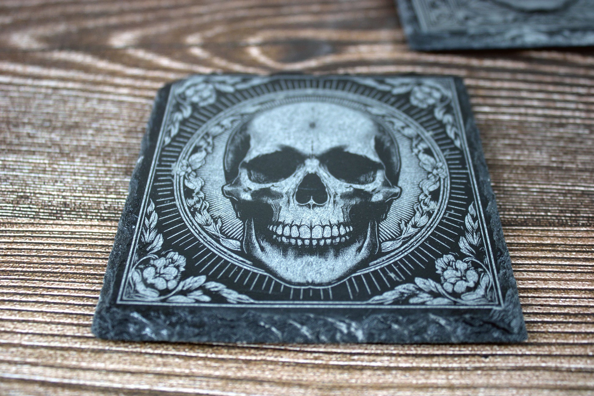 This set includes two engraved slate coasters, each featuring a striking skull design. Perfect for adding a touch of gothic style to your home, they make a unique housewarming or wedding gift – and an even better Halloween present.